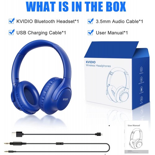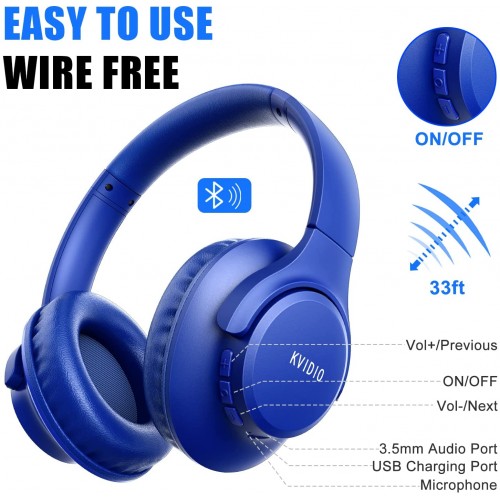 Bluetooth Headphones Over Ear,KVIDIO 55 Hours Playtime Wireless Headphones with Microphone,Foldable Lightweight Headset with Deep Bass,HiFi Stereo Sound for Travel Work Laptop PC Cellphone (Blue)