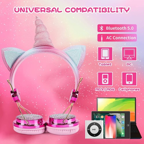 Kids Headphones, Unicorn Bluetooth/Wired Headphones with Microphone Adjustable Headband,85dB Volume Limited HD Sound Headphones for School, Birthday, Xmas, Unicorn Gift (Diamond Blue)